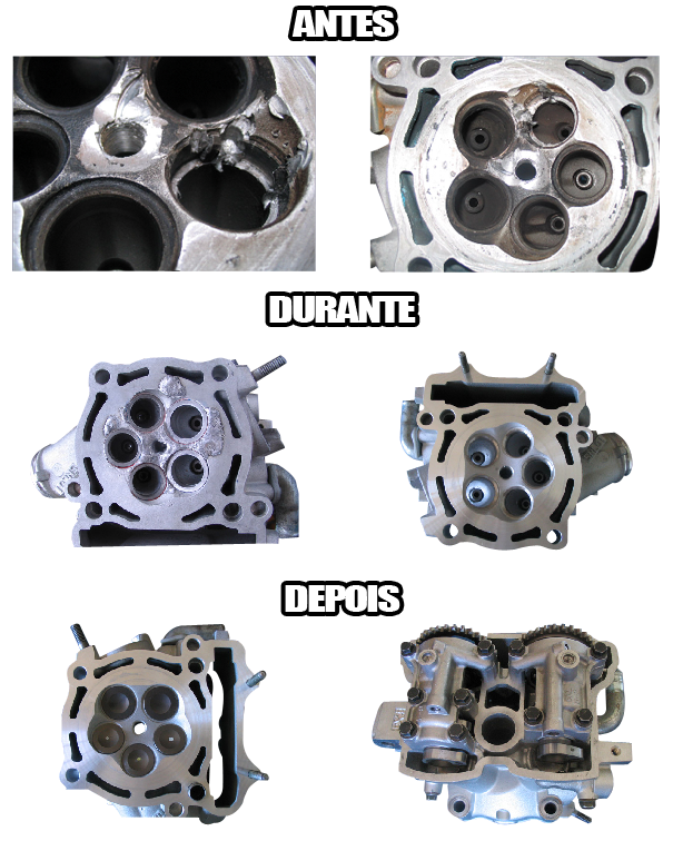 Solda / Rosca de vela / Troca de sedes / Retífica de sedes / Retífica de válvulas / Troca de guias / Assentamento de válvulas / Montagem do cabeçote completo com comando de válvulas / Retífica de pastilhas com ajuste de folgas nos padrões do fabricante.