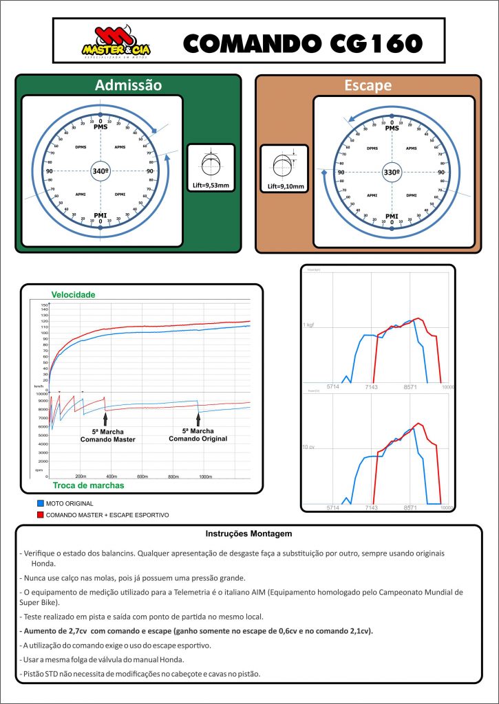 Desenvolvido pela Master & Cia, para concorrer no segmento de preparação, com qualidade. O comando vai pronto para a montagem. Com ele você melhora as rotações média/alta de sua moto. Um outro fator importante, o comando é usinado de um peça bruta, obtendo um produto com uma qualidade superior.